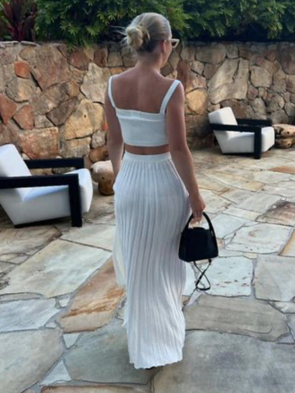 Knitted Camisole + Skirt Elegant Sleeveless Short Top Pleated Skirt Set