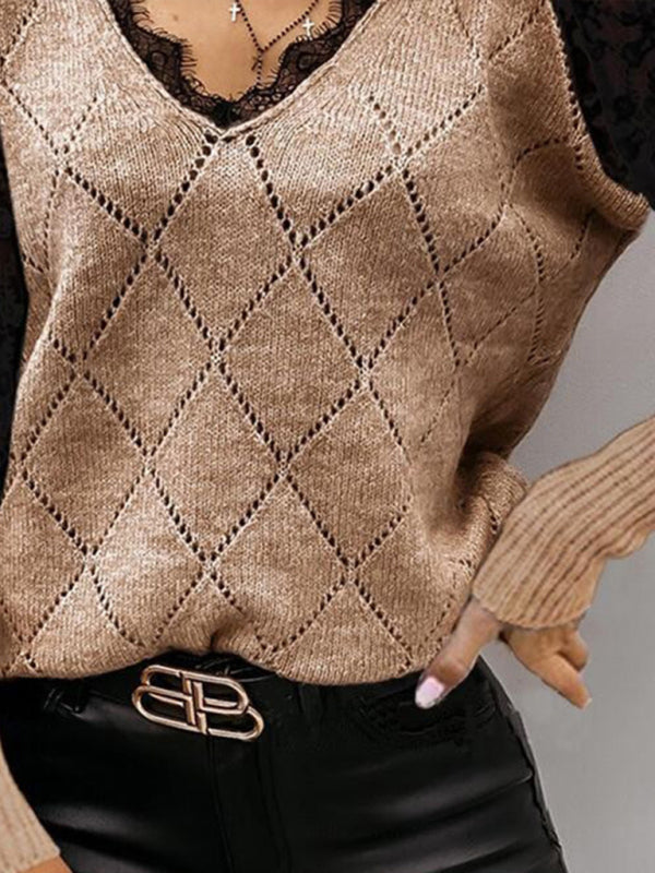 Knitted Lace Bottom Top Sexy V Neck Fashion Versatile Rhombus Sweater Women