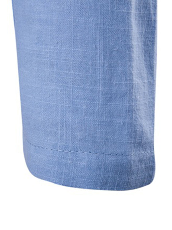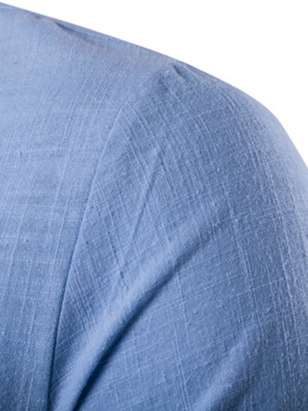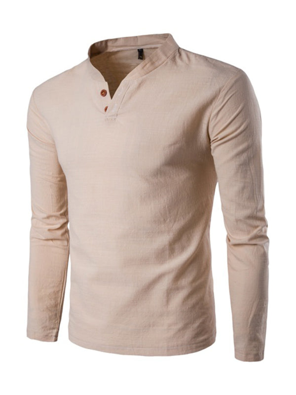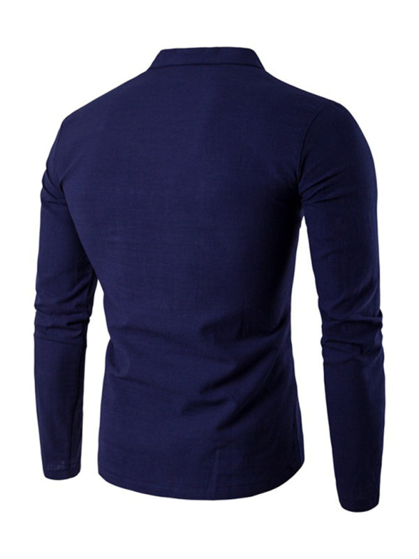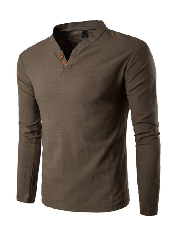 Men's Solid Color Slub Notched Collar With Button Up Long Sleeve T Shirt