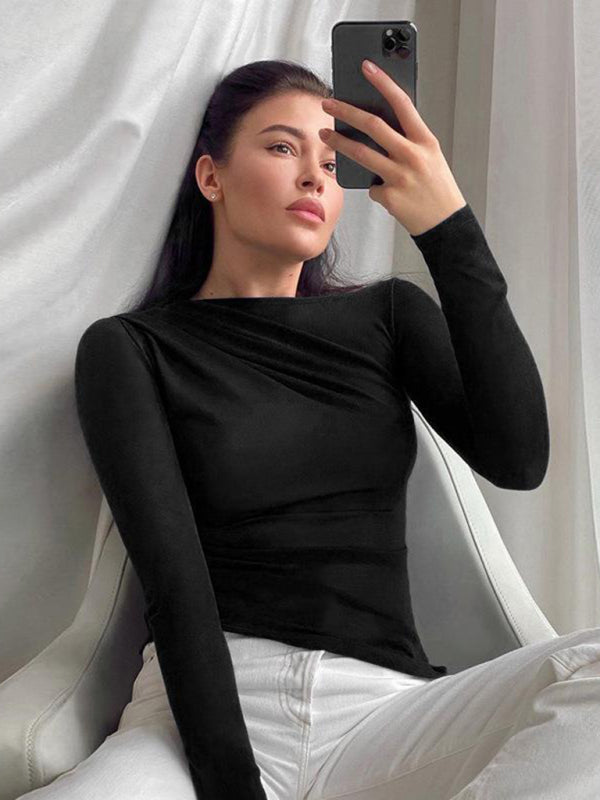 New solid color versatile round neck pleated long sleeve inner slim fit T-shirt
